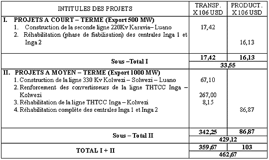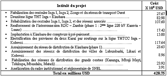 - Divers travaux de réhabilitation (centrales d'Inga 1 et 2, postes 220 kV Inga - Kinshasa, réseau MT/BT de Kinshasa, centrale de Zongo) et travaux d'implantation des réseaux MT et BT dans les deux Kasaï par l'installation soit des centrales hydroélectriques, soit des micro-centrales, soit des systèmes d'énergie renouvelable.