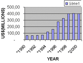 YEAR | US$ MILLIONS | *1990 | 62,34 | *1991 | 62,55 | *1992 | 68,42 | *1993 | 71,70 | *1994 | 119,31 | *1995 | 159,67 | *1996 | 276,24 | *1997 | 329,06 | *1998 | 401,70 | *1999 | 404,41 | *2000 | 400,00 | Source: GEPC |