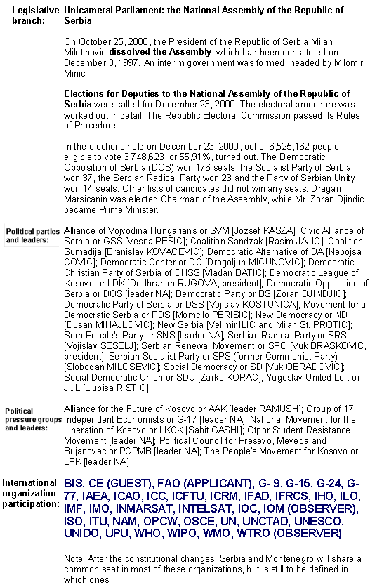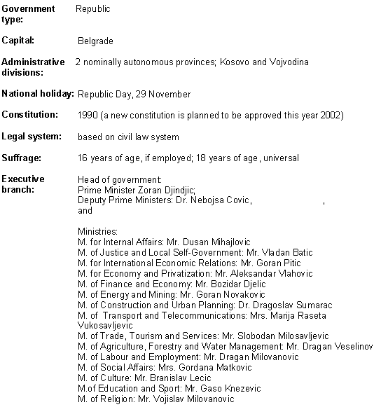 The Republic of Serbia, together with the Republic of Montenegro, is a constituent part of the Federal Republic of Yugoslavia, recently named Serbia and Montenegro, in a constitutional form yet to be defined. It contains two autonomous provinces: Vojvodina and Kosovo and Metohija. Belgrade is the capital city. With a population of two millions, it is the administrative, economic and cultural heart of Serbia and Yugoslavia.