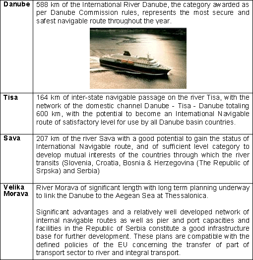 Velika Morava River Morava of significant length with long term planning underway to link the Danube to the Aegean Sea at Thessalonica. Significant advantages and a relatively well developed network of internal navigable routes as well as pier and port capacities and facilities in the Republic of Serbia constitute a good infrastructure base for further development. These plans are compatible with the defined policies of the EU concerning the transfer of part of transport sector to river and integral transport.